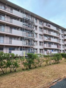 足場を組んでいる所の居住者の方々には、ご迷惑をおかけしますが、ご理解ご協力をお願いいたします。来年の大規模修繕工事の時は、全体に足場がかかりますので、よろしくお願いします。