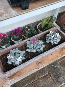 事務所玄関前のお花も、気がつけば雪化粧していました。